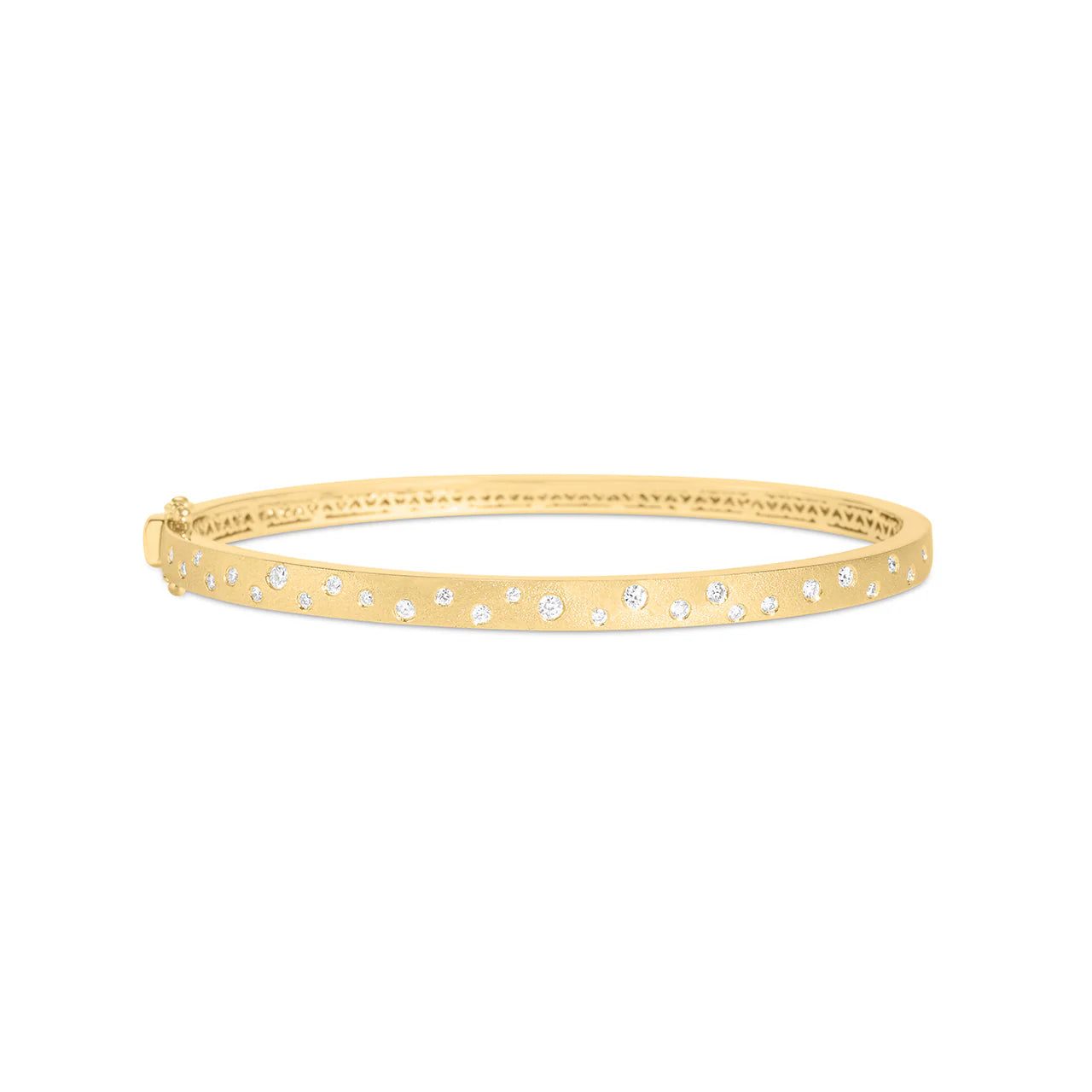 Scatter joy on your wrist with this delicate 14K yellow gold bangle from our Confetti collection. Featuring 0.34 carats of shimmering diamonds artfully dispersed across a sleek 4mm-wide band, this narrow bangle strikes the perfect balance between understated elegance and eye-catching sparkle. Layer it solo for minimalist charm or stack it with other pieces for a personalized look. A versatile everyday treasure that catches the light—and compliments—with every gesture.