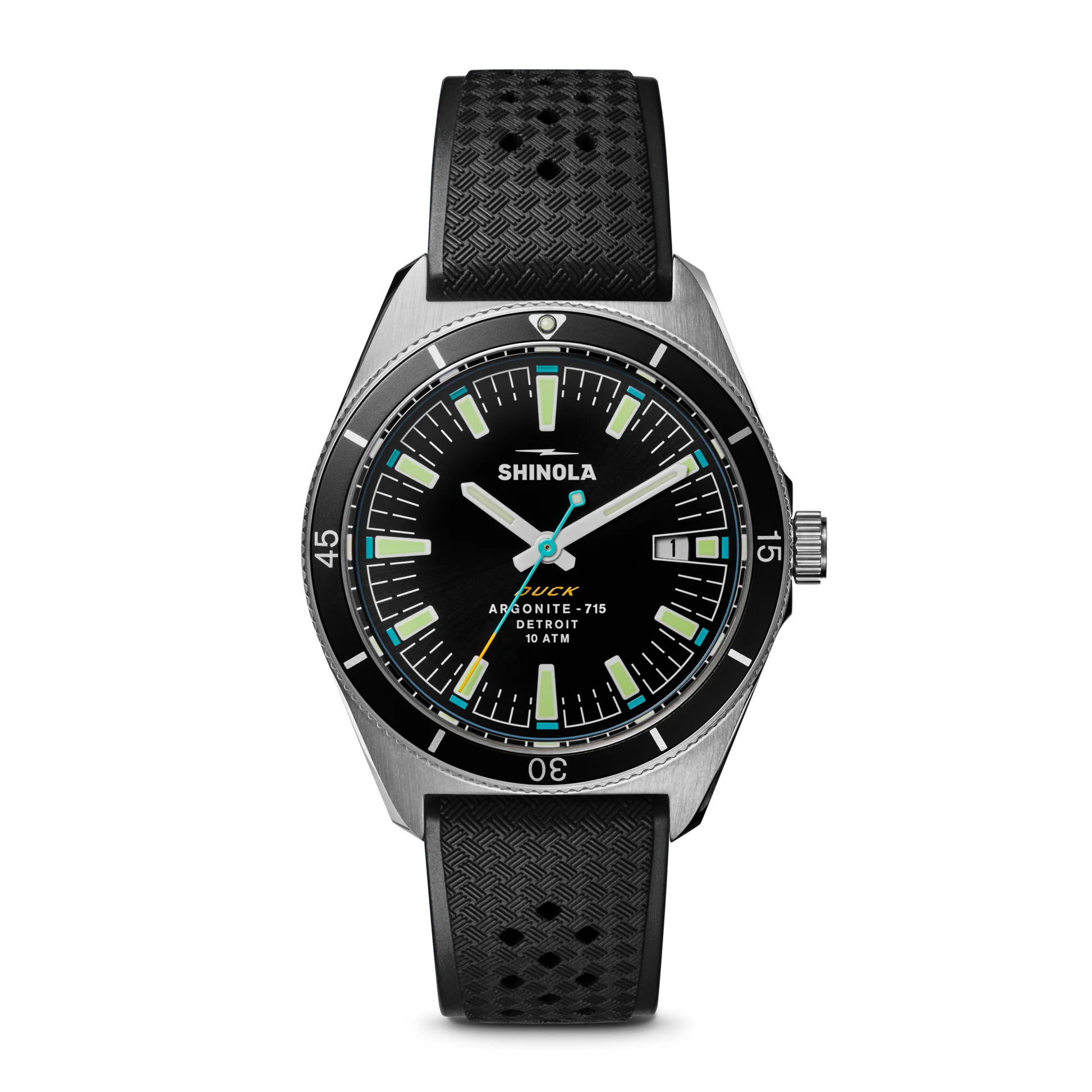 The Duck 3hd 40mm is a sophisticated sport watch designed for adventure and style. Featuring a stainless-steel case with a screw-down crown and unidirectional bezel, it offers durability and water resistance. The sapphire crystal and C3 SuperLumi-Nova on the dial and hands ensure clear visibility in any light. Its reimagined tropic-style black rubber strap with a basketweave texture complements the sleek design. The custom caseback showcases an intricate relief etching of the Duck in action, making this timepiece as striking out of the water as it is built to perform within it.