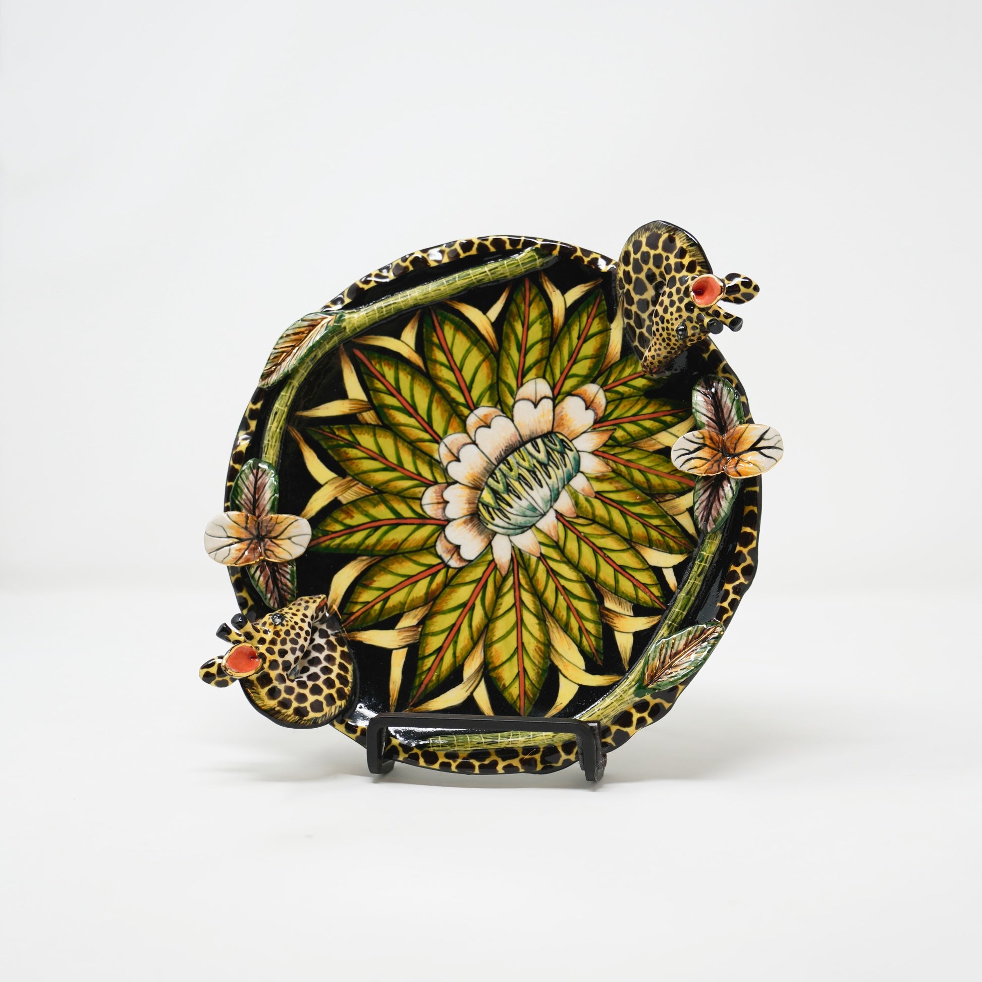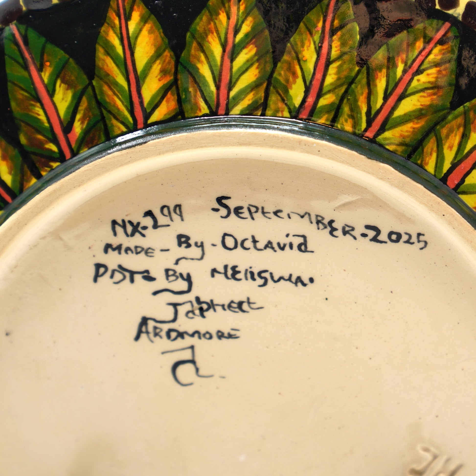 The vibrant design — a radiant bloom surrounded by layers of green and gold leaves — captures Ardmore’s signature blend of bold color, intricate detail, and African flora. Each sculpted detail, from the giraffes’ watchful expressions to the softly curling leaves, is meticulously modeled and painted by hand.