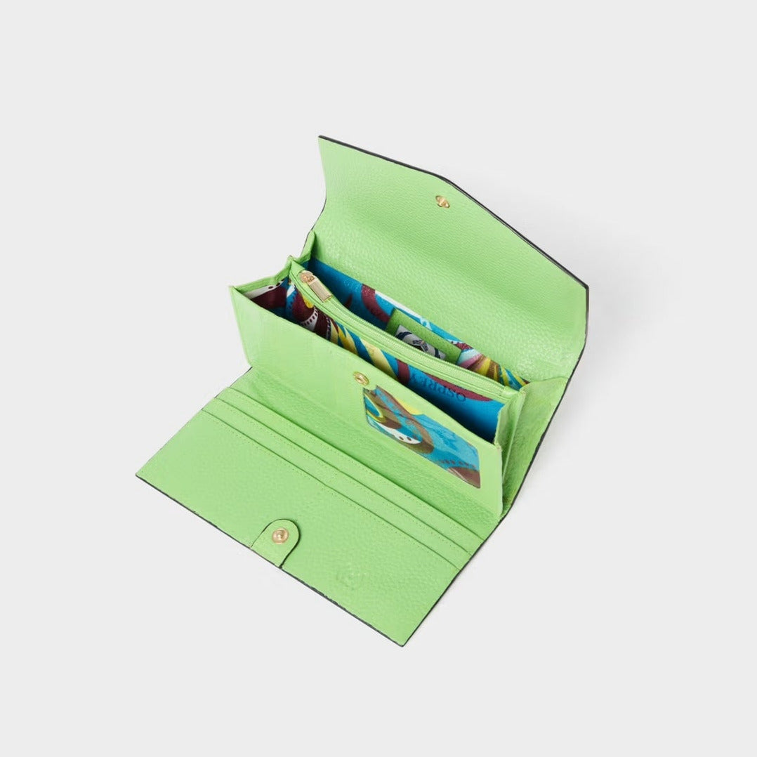 Sleek and slim, the Hendrix Matinee has a cleverly constructed fold-over to reveal an organized interior with two slip pockets, two compartments, eleven card slots, an ID section, and a zipped coin purse. Flip it over, and on the back is a second zipped compartment with a gold metal zip-pull.