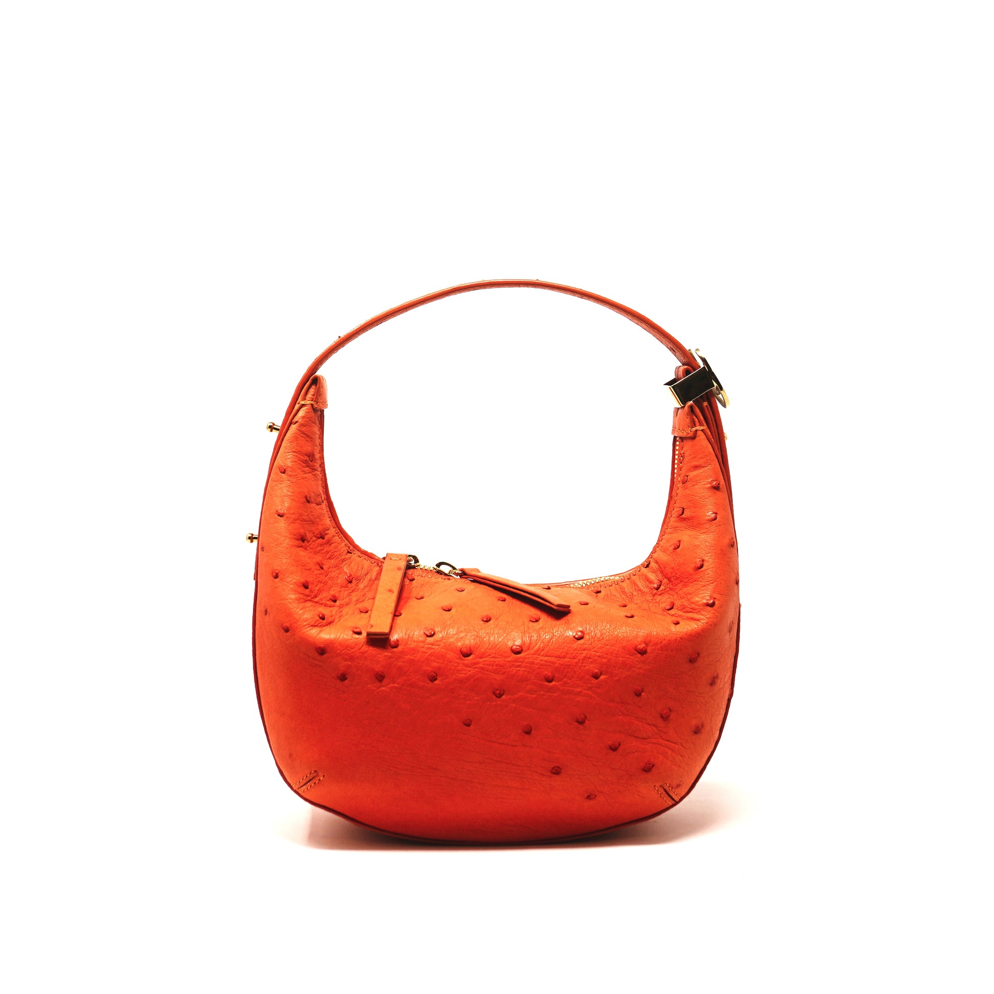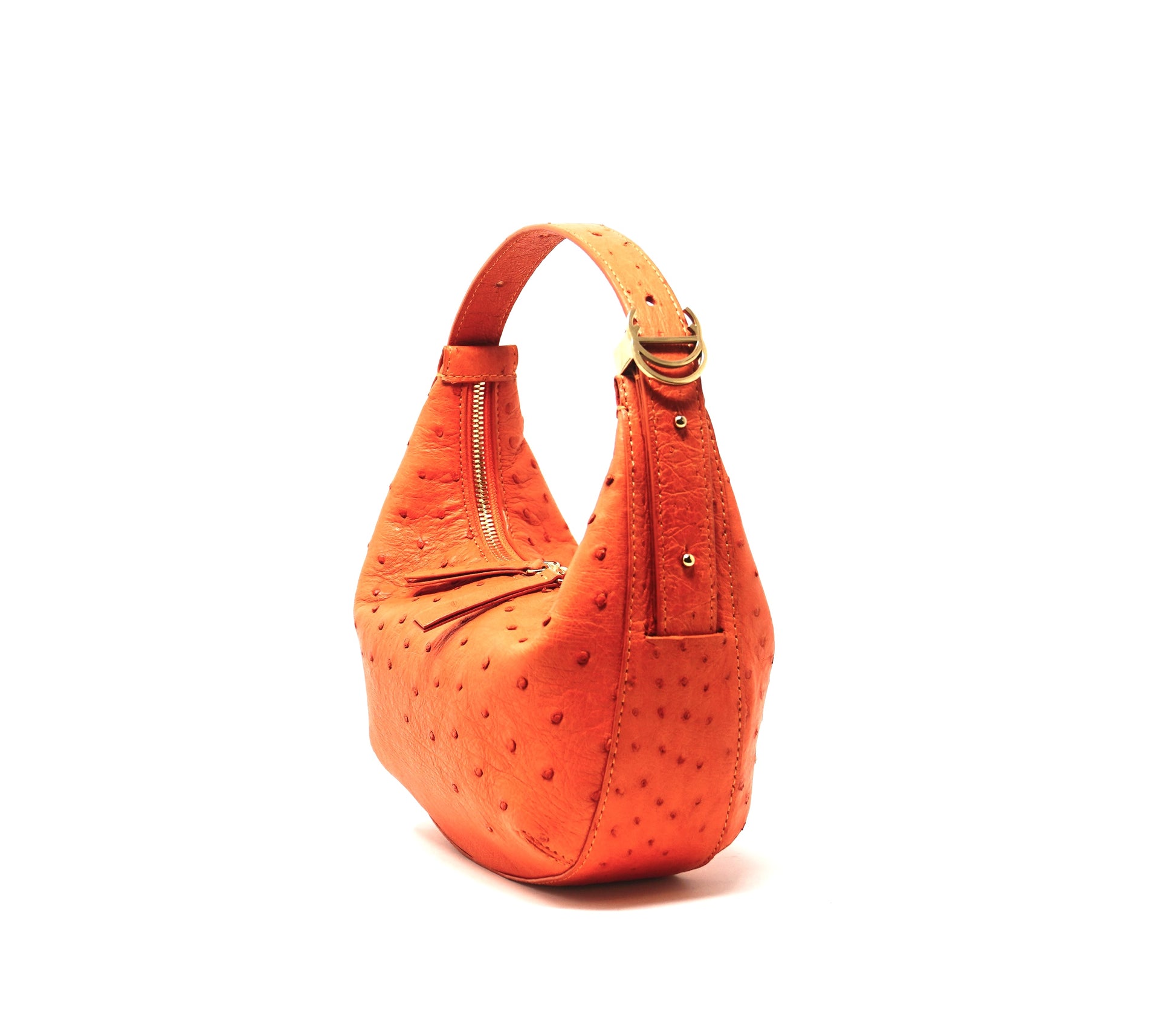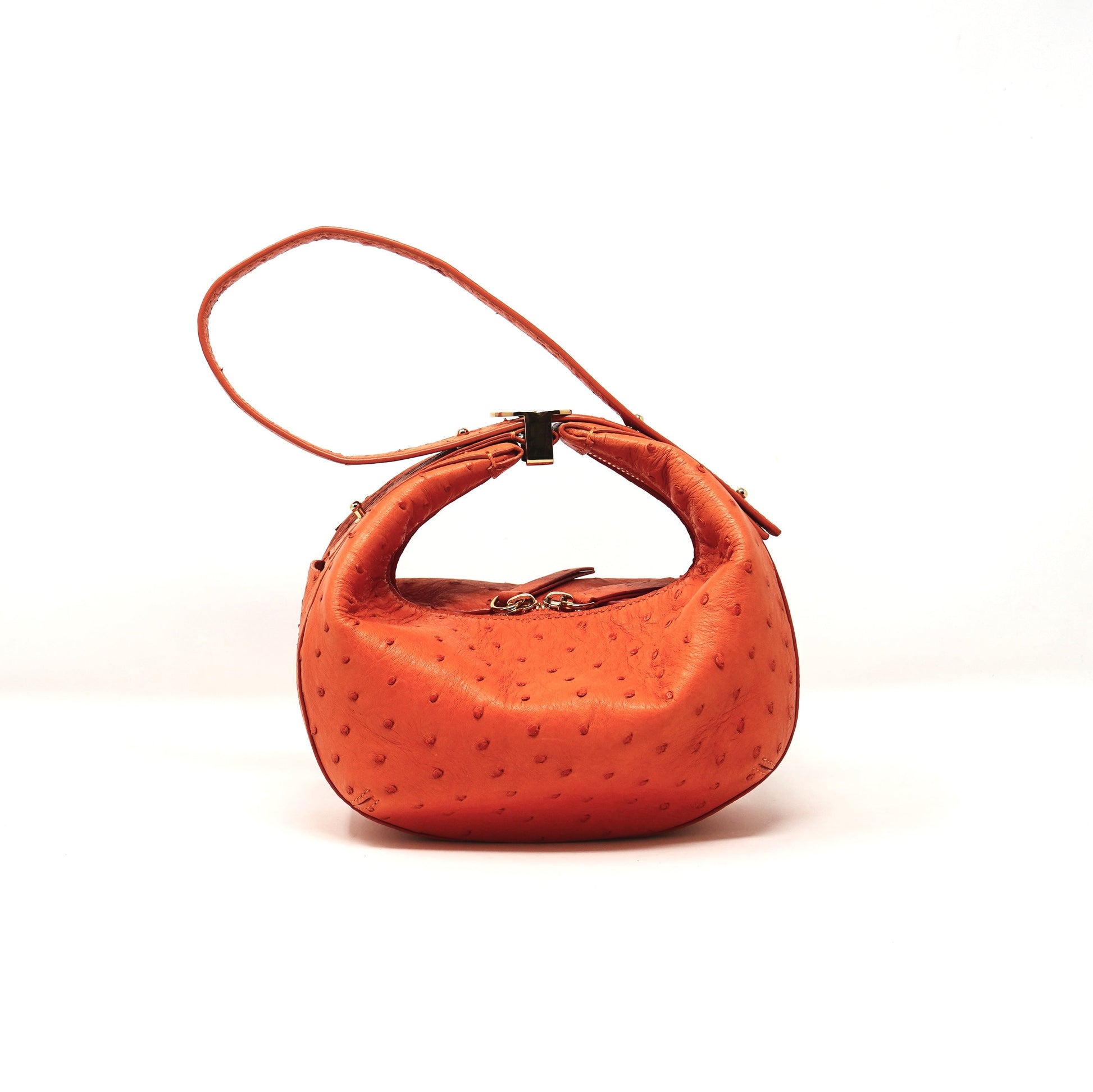Get versatile with our Lolita in Tangerine Ostrich! This fun bag can be worn as a wristlet, hand or underarm bag with its adjustable strap. With a leather and suede interior lining and handy pockets, it's the perfect combination of style and function.