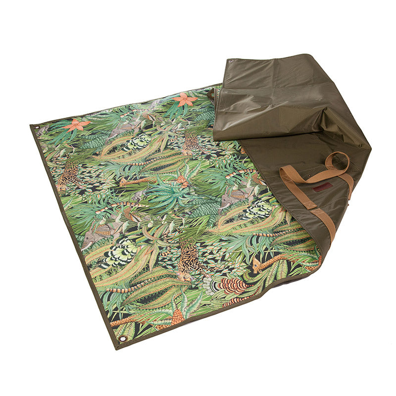 The iconic Melvill & Moon picnic mat is elevated in the Ardmore Outdoor Fabric, with waterproof backing and eyelets on each corner. It folds up easily with carry straps.