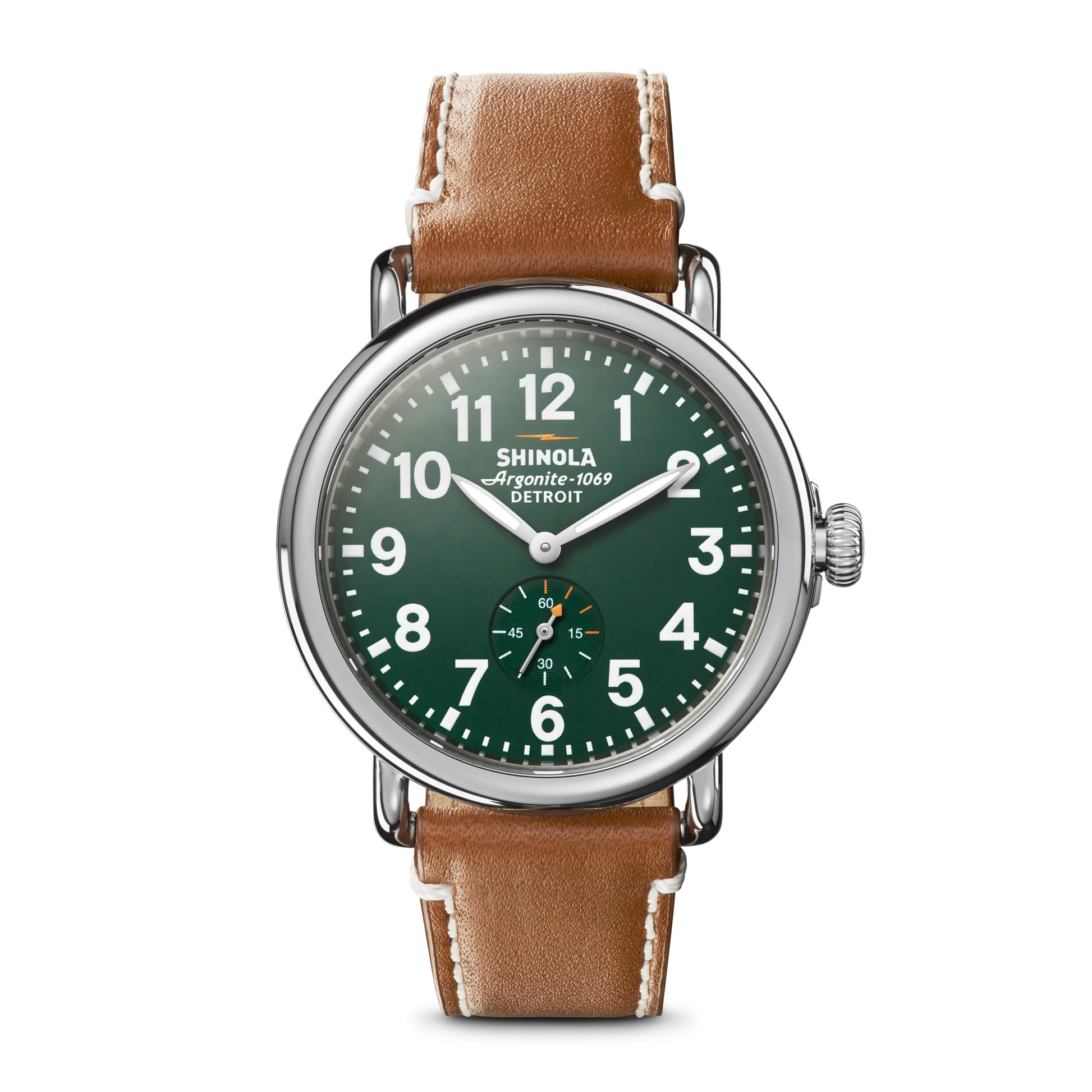 It's hard not to envy a face like this one. This 41mm Runwell features a rich green dial set in a solid stainless steel case finished with a classic pumpkin crown. The double-domed sapphire crystal protects the watch from scratches through years of wear. The maple leather strap will develop a unique patina over time to give your timepiece a one-of-a-kind look.