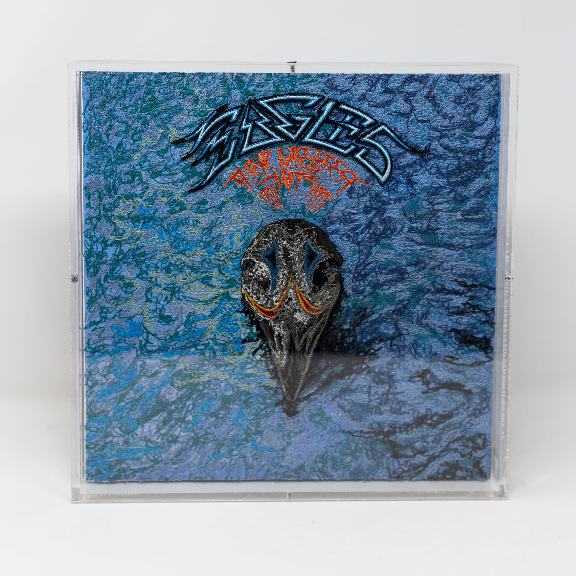 Celebrate rock history with Stephen Wilson’s embroidered take on Eagles: Their Greatest Hits. This vibrant artwork brings the iconic eagle skull and bold lettering to life with colorful thread and texture, all showcased in a sleek acrylic case. It’s a fun, crafty tribute that turns a classic album cover into a standout collectible perfect for any music lover’s wall.