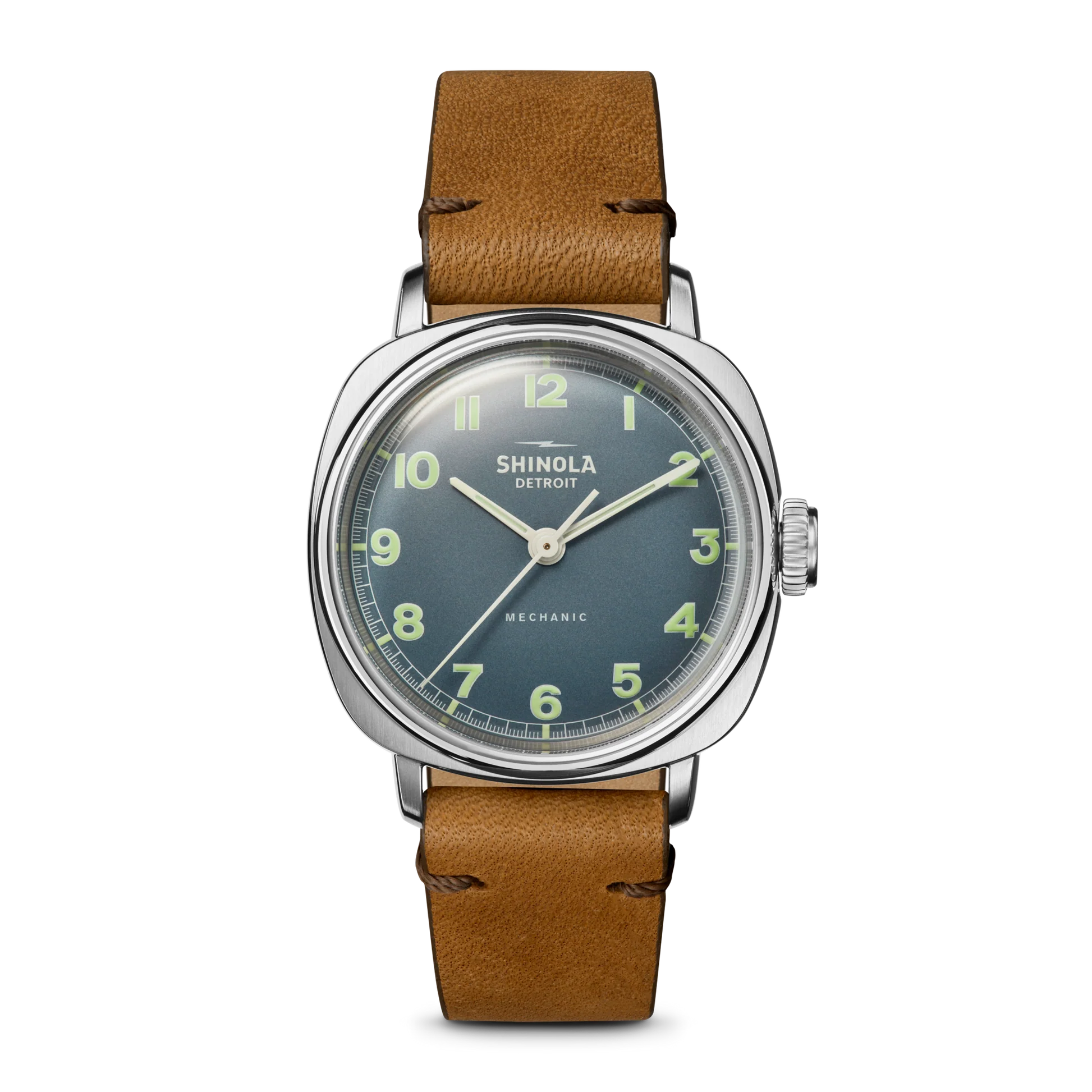 The Mechanic is a refined hand-wound mechanical watch celebrating the art of analog craftsmanship. Inspired by Detroit’s sign painters, it features a domed dial, box crystal, curved hands, and a textured crown for effortless winding. The dial’s layered numbers reflect classic sign painting styles, while the case back window reveals the intricate manual movement inside. Paired with a British tan leather strap, this 39mm timepiece blends vintage charm with lasting performance, offering over 42 hours of power reserve—a distinguished choice for discerning watch enthusiasts.
